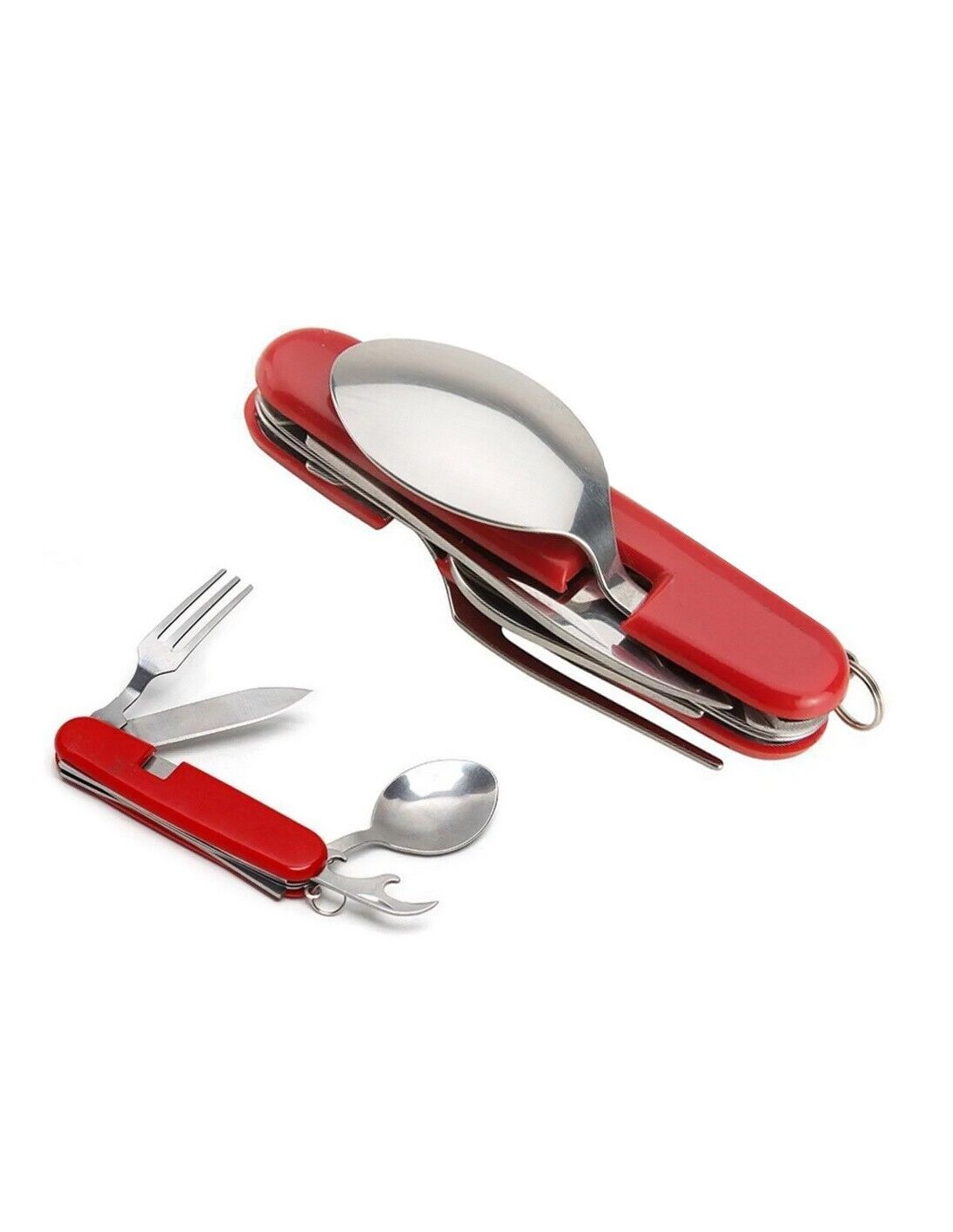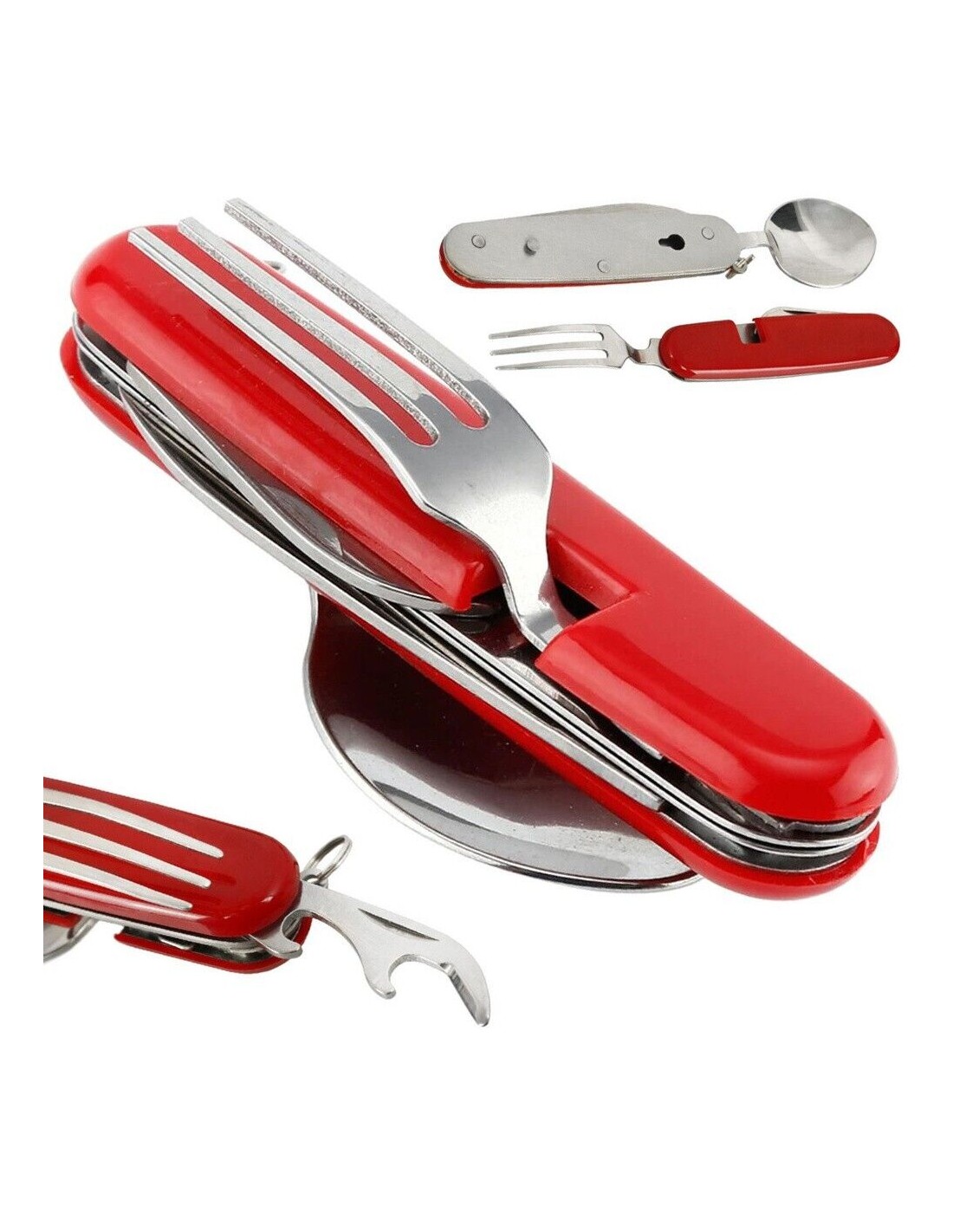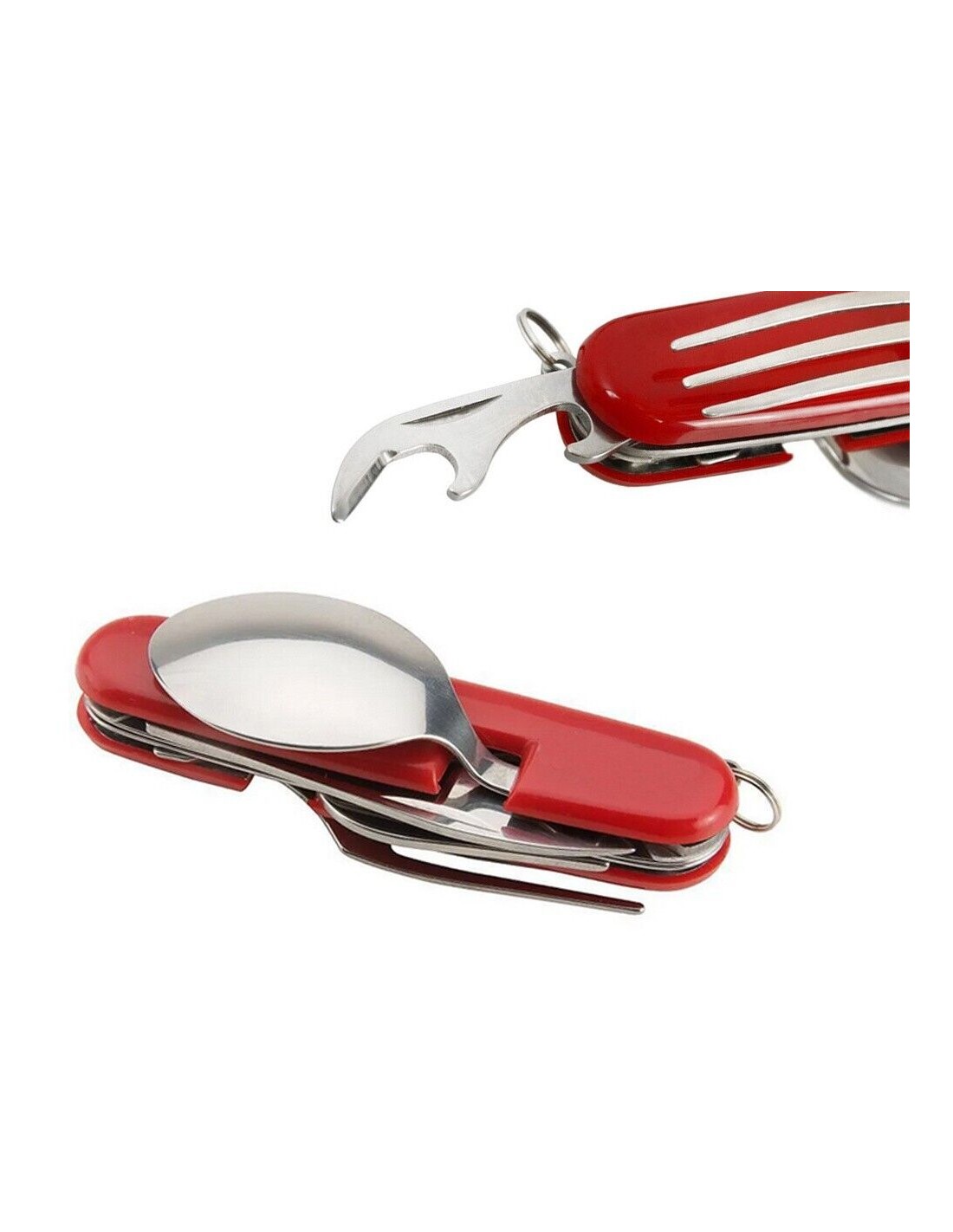 Es hat eine kompakte Größe, so dass Sie es leicht in Ihrer Hosentasche oder Ihrem Rucksack unterbringen können. Ein äußerst praktischer kleiner Gegenstand, den Sie überallhin mitnehmen können. Außerdem lässt sich das Taschenmesser in zwei Teile aufklappen, so dass Sie problemlos einen Löffel und eine Gabel verwenden können.