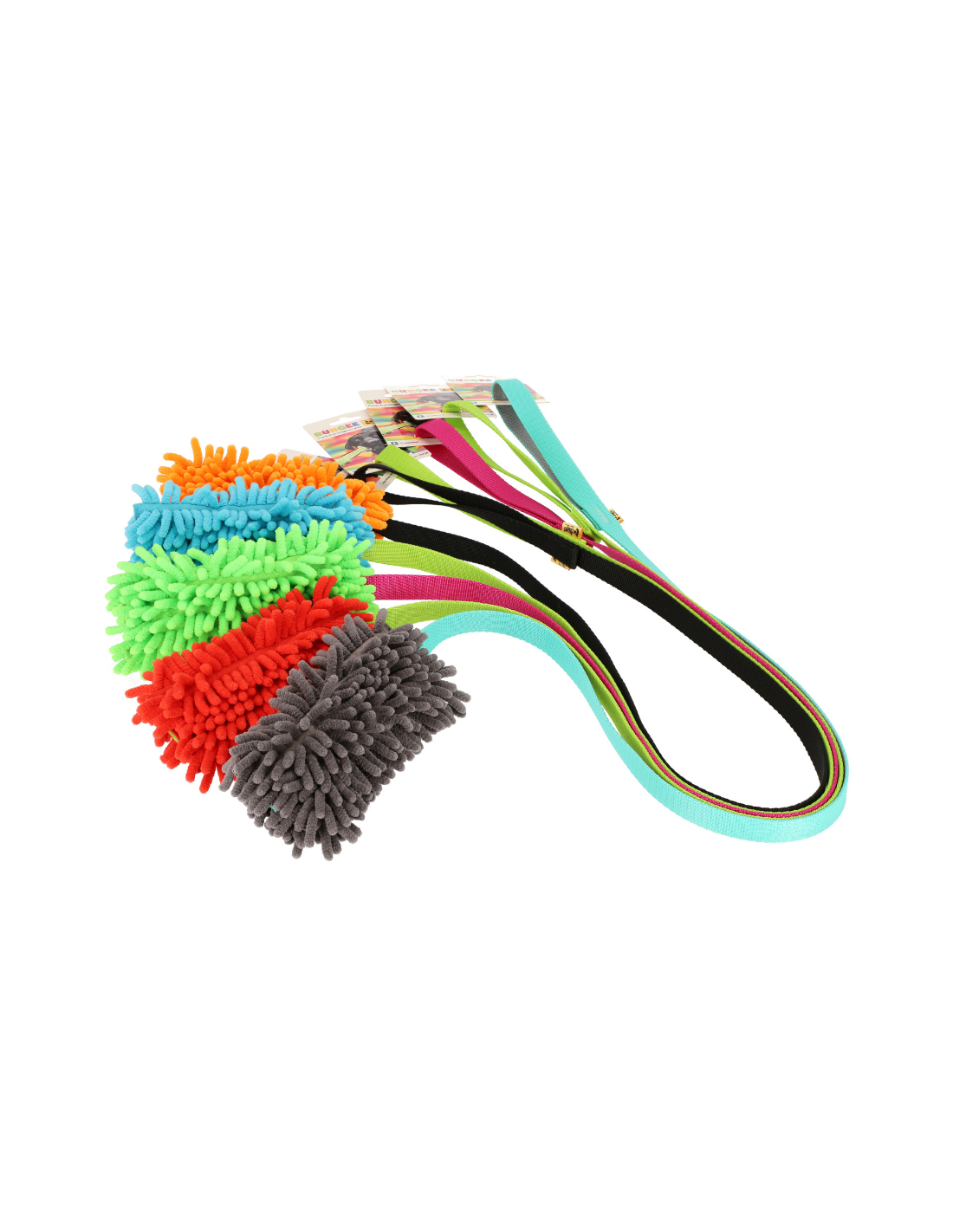 Der Mop Tugger ist ein farbenfrohes Hundespielzeug, das durch sein buntes Material mit Quasten auffällt! Dank des bequemen Griffs können Sie ihn einfach greifen und mit Ihrem Hund spielen!